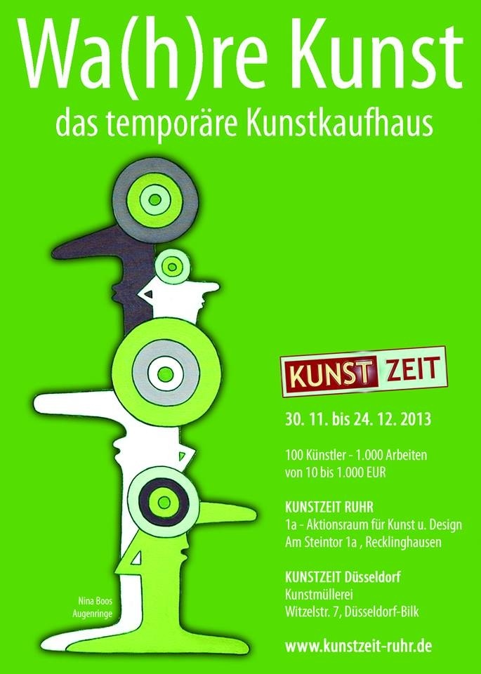 Zum zweiten Mal nehme ich an dem temporären Kunstkaufhaus Kunst.Zeit teil, das dieses Jahr parallel an zwei Orten stattfinden: im 1a Aktionsraum für Kunst und Design in Recklinghausen und in der „Kunstmüllerei“ in Düsseldorf.