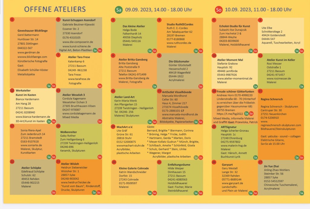 Ich nehme am Sonntag, den 10. September von 11 bis 18 Uhr an den offenen Ateliers in der Region teil. Organisiert wird diese Veranstaltung vom Verein Kunst in der Provinz e.V. Einige der teilnehmenden Ateliers öffnen an beiden Tagen des Wochenendes.